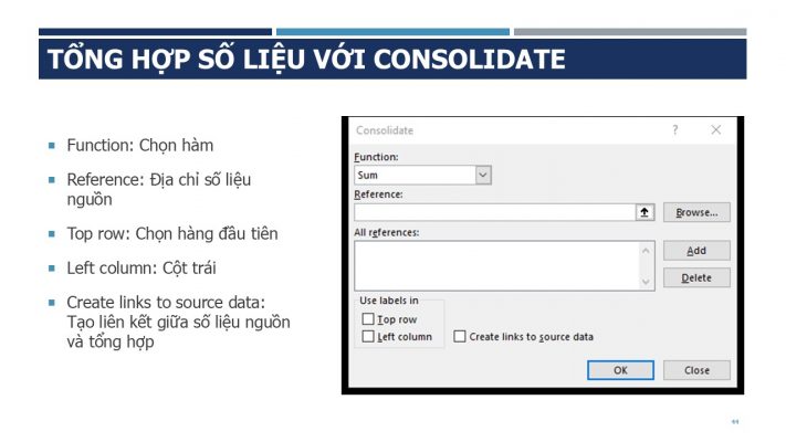 - Nếu dữ liệu ở nhiều file khác nhau, cần mở tất cả file trước khi chọn Consolidate.