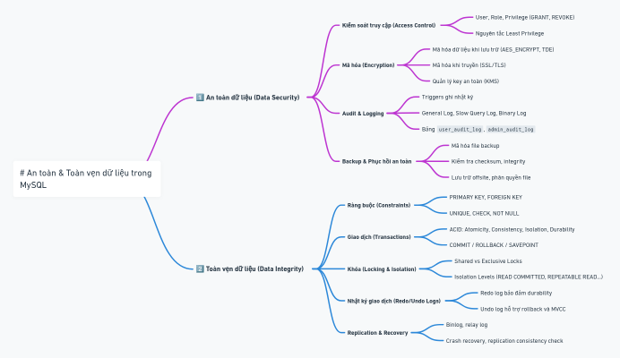 - Nguồn audit: triggers (bảng nội bộ), general_log, slow_query_log, binary log (forensic), hệ thống audit plugin (Enterprise).